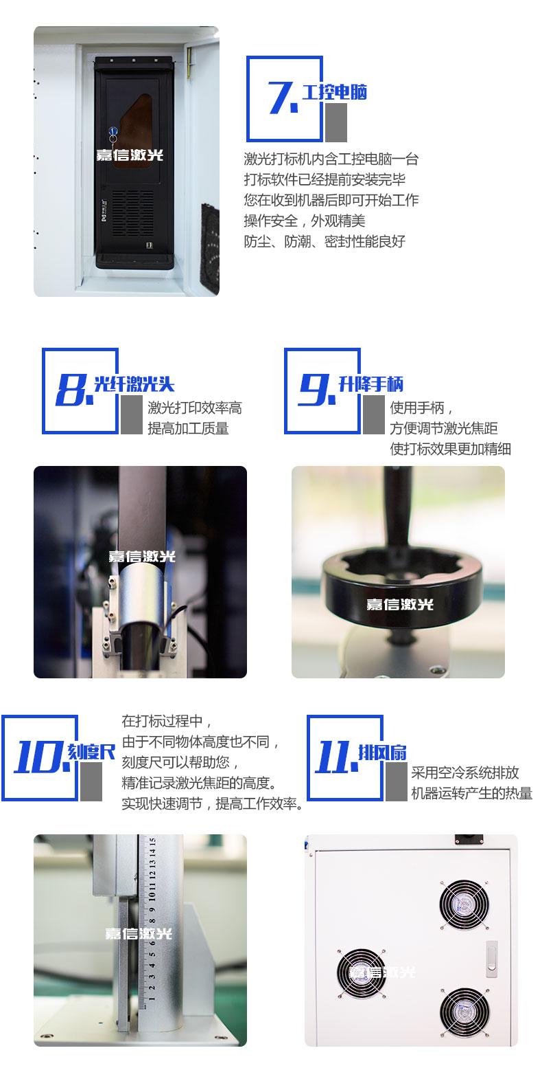 嘉信激光公司制造團隊制造出該款立柜式光纖激光打標(biāo)機,充分考慮操作人員的使用體驗,參考友好型人性化設(shè)計的原理,擁有如此人性化的設(shè)計之外,該機器更是配置進口激光器,光束質(zhì)量優(yōu)越,配合嘉信的打標(biāo)軟件,提供更好的打標(biāo)行業(yè)解決方案。