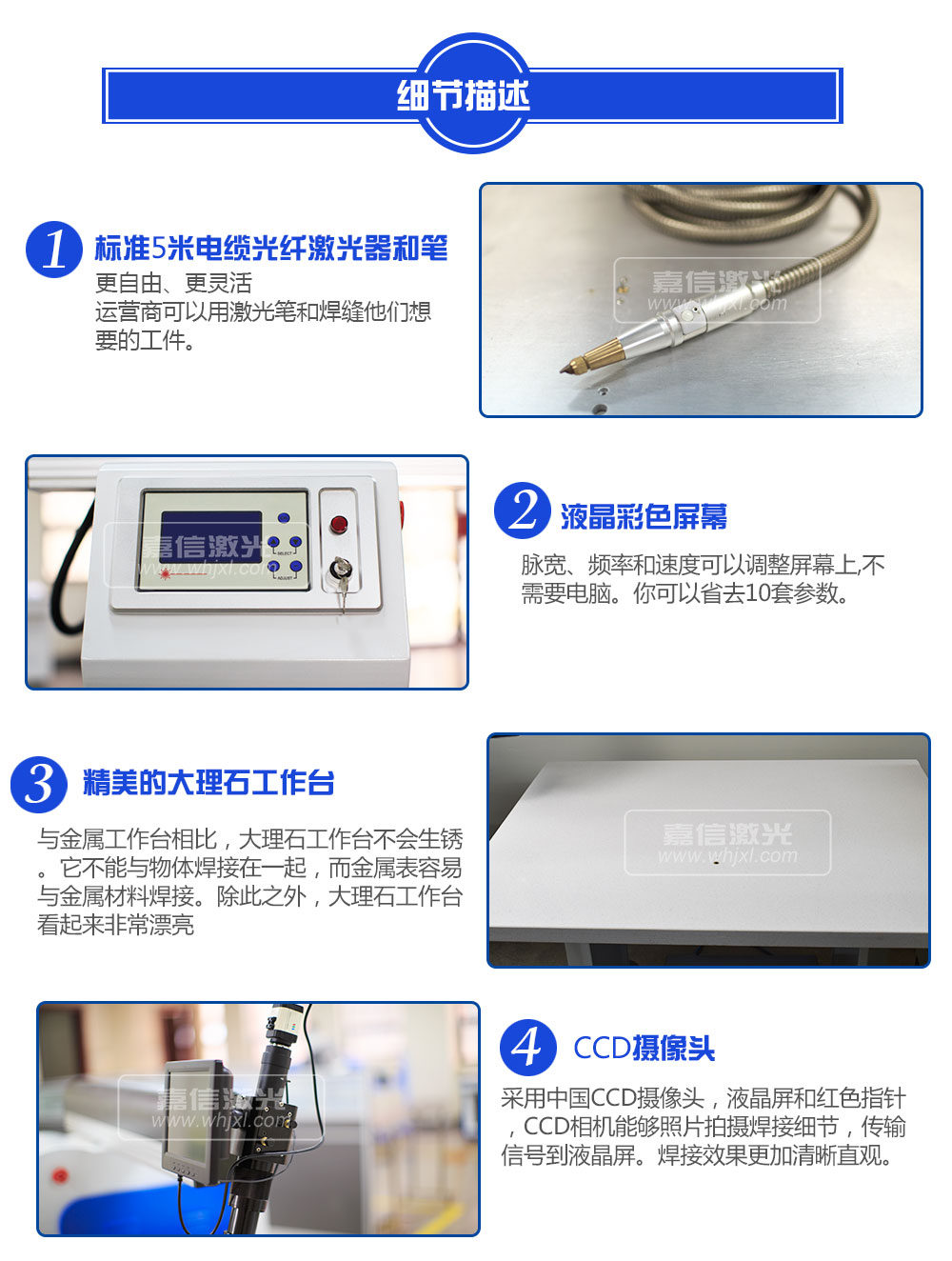 武漢嘉信激光有限公司專注激光設備行業二十年,生產多種類型焊接機,產品廣受國內外用戶好評。該款雙光路焊字機是雙光路設計,光纖長達5米,相比傳統焊接機,焊接方式更靈活,焊接精度更高,焊接效果更好。