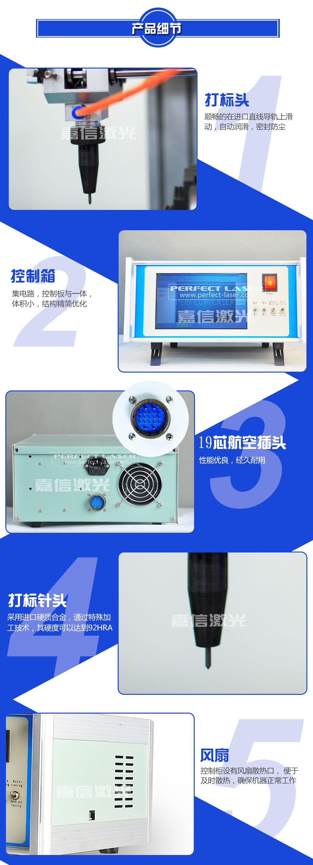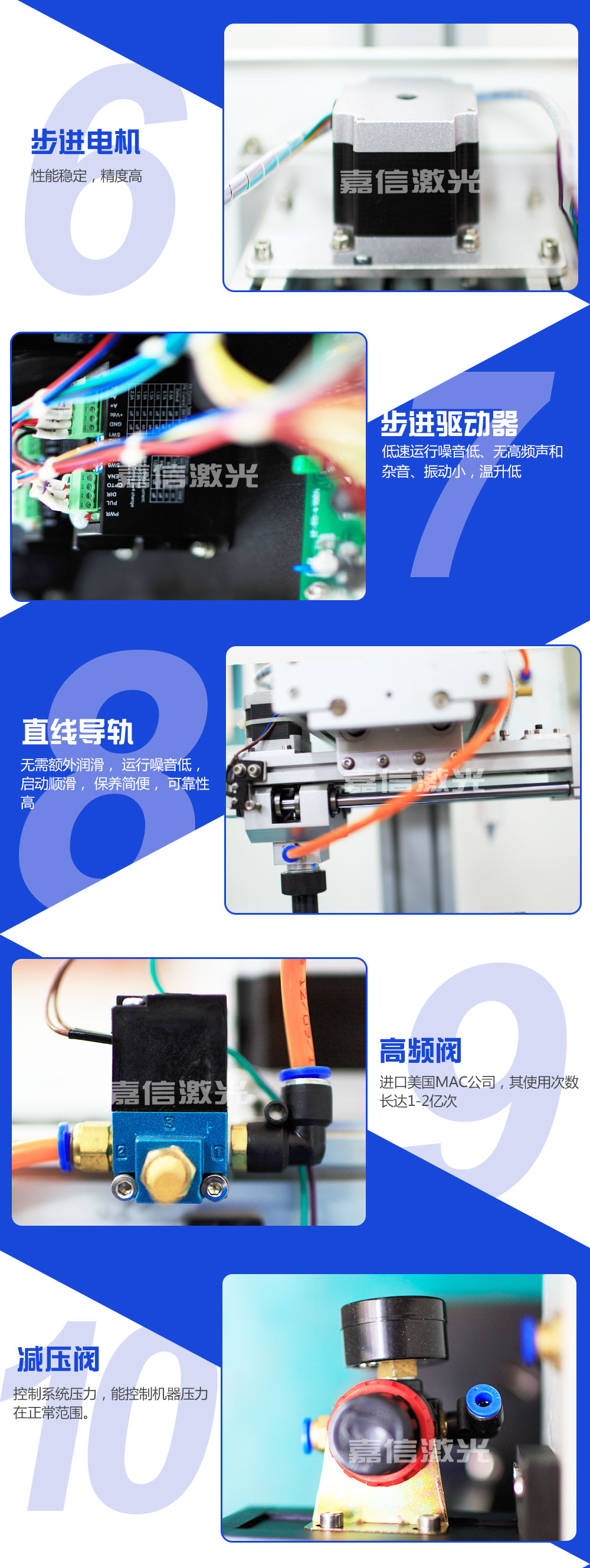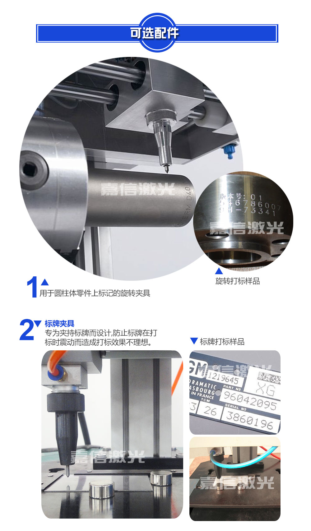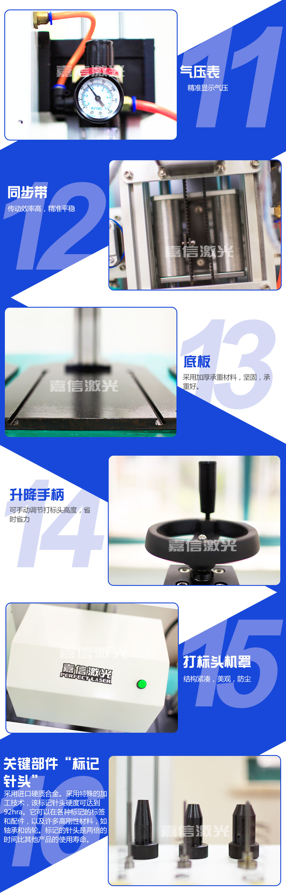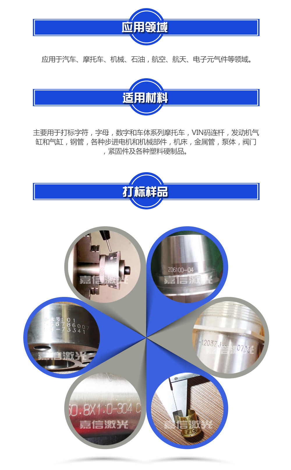 嘉信激光設(shè)計生產(chǎn)的旋轉(zhuǎn)氣動打標機技術(shù)成熟,運行穩(wěn)定。在世界各地,每天都有無數(shù)臺嘉信激光的旋轉(zhuǎn)氣動打標機正安全、良好地運行著,它們廣泛應用于鋼鐵冶金、有色金屬、汽車及零部件、航天航空、軍工電子、精密儀器儀表、機械制造、模具、五金工具、集成電路﹑半導體制造、太陽能、教育、通訊與測量、包裝、鞋材皮革、 塑料橡膠、珠寶首飾、工藝禮品等各個行業(yè),為世界各地用戶提供者優(yōu)良的品質(zhì)和服務(wù)。