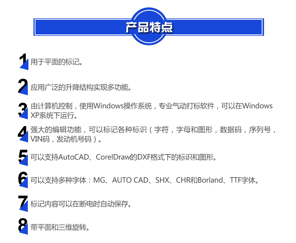 2. 旋轉(zhuǎn)氣動打標機系統(tǒng)里面的中英文字庫多套可選,可直接調(diào)用WIN系統(tǒng)字庫使用,并可自由添加;