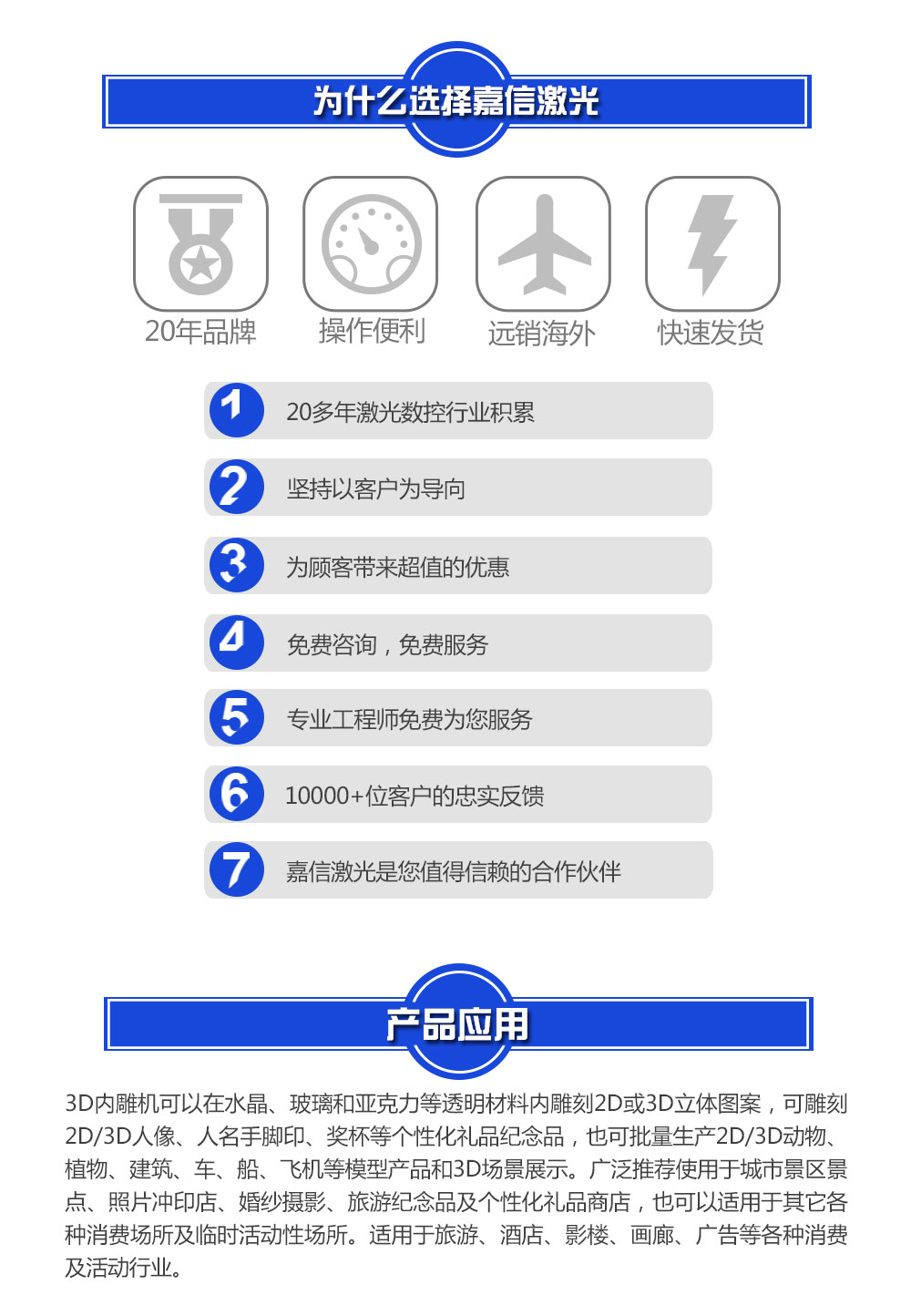 2.智能化操作:3D水晶內雕機采用激光自準直技術和閉環監控系統,24小時連續運轉工作,圖像內雕刻“零寬度”拼接技術,人性化的系統控制和監控操作設計,一鍵式完成雕刻工作,避免人為操作失誤。
