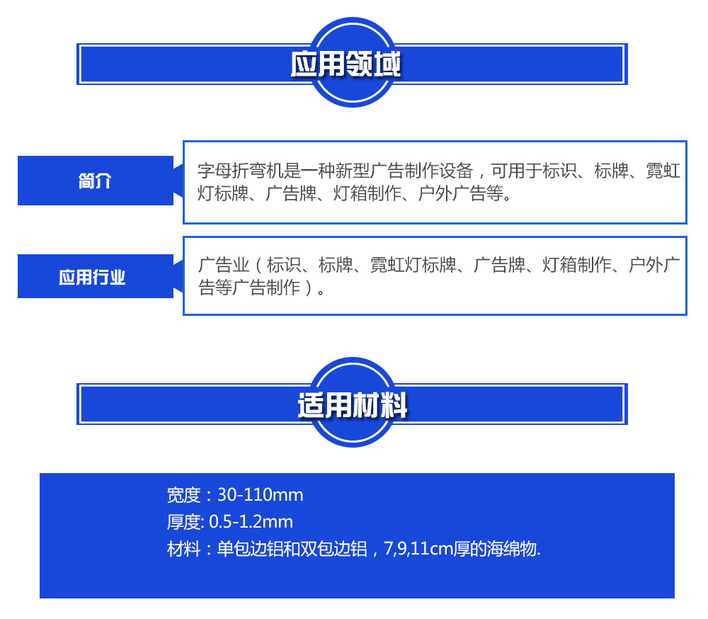 包邊字折彎機適用行業:廣告字行業,如制作外露字,各種型材圍邊字、無邊字、環氧樹脂字、不飽和樹脂字、各類小字等